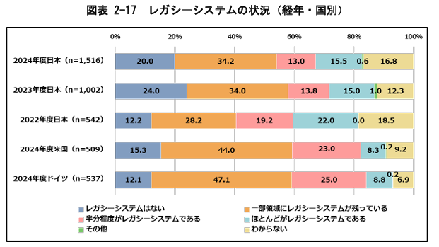 IPAのDX調査によると、『半分程度がレガシーシステム』と回答した日本企業は「34.2%」、『一部領域にレガシーが残っている』と答えた日本企業も「13%」に上り、総じて約7割の日本企業がレガシーシステムを依然として残していることが示されています。(出典:IPA「DX動向2025」P46、図表2-17参照)。