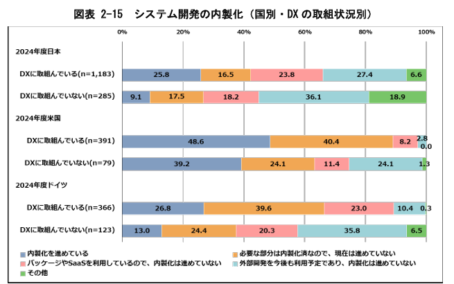 IPAによる調査(図表2-15)によれば、DXに取り組んでいる日本企業のうち『内製化を進めている』割合は「25.8%」にとどまっている一方で、米国では「48.6%」とおよそ半数を占めており、ドイツでも『内製化を進めている』企業が「26.8%」に加えて、『必要な部分は内製化済みなので、現在は進めていない』企業が「39.6%」と、日本と比較して諸外国では社内DXの内製化が進んでいることがわかります。(出典:IPA「DX動向2025」)