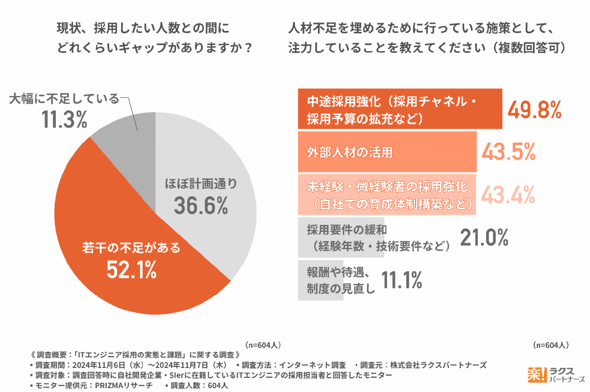 実際、「ITエンジニア採用担当者への調査」では、採用計画に対して「若干の不足がある」「大幅に不足している」と回答した企業が過半数を占めています。採用活動を強化しても、計画どおりに人員を確保できない企業が多いのが現状です。