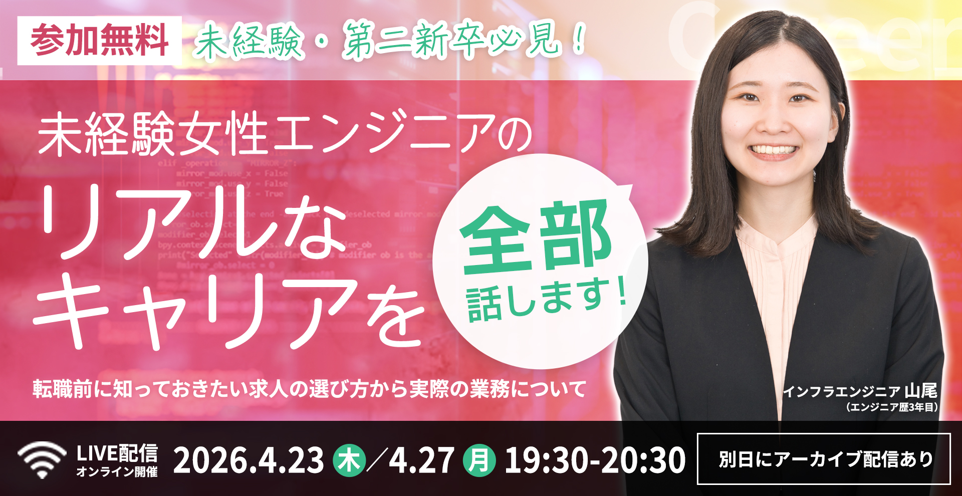 【4/23(木)・4/27(月)・5/7(木)開催】未経験女性エンジニアのリアルなキャリアを全部話します!|転職前に知っておきたい求人の選び方から実際の業務について