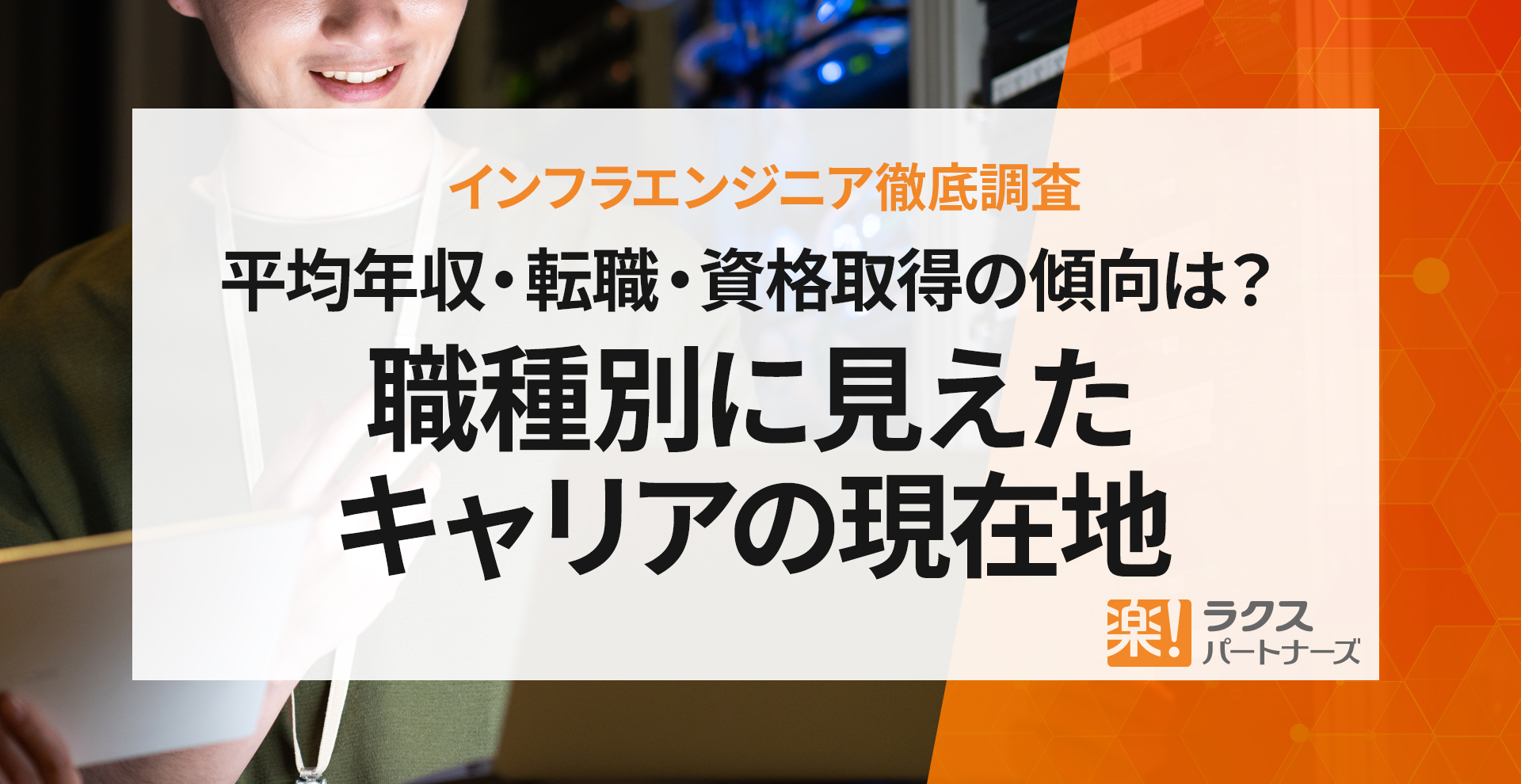 2025.10.21 NEWS 【インフラエンジニア徹底調査】平均年収・転職・資格取得の傾向は?職種別に見えたキャリアの現在地ITエンジニアの派遣・SES事業を展開する株式会社ラクスパートナーズ(東京都新宿区、代表取締役:吉田 雅行)は、20~50代のインフラエンジニア(※実務経験1年以上・年収300万円以上)を対象に「インフラエンジニア徹底解剖:キャリア・働き方・年収・資格」に関する調査を実施しました。