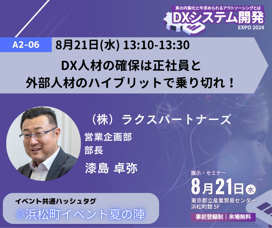 2024年度夏第2回となる<DXシステム開発Expo 2024 ~真の内製化と今求められるアウトソーシングとは~>は、企業のDX推進にむけた【 IT人材の育成・確保・再教育】、【 システムの内製化】、【 業務自動化】 、【 超高速開発】 等をテーマに、カンファレンス形式ではなく展示会を メインに、最新技術とソリューション、そして事例を紹介する場として開催され、当社も協賛企業として出展し、セミナー登壇致します。