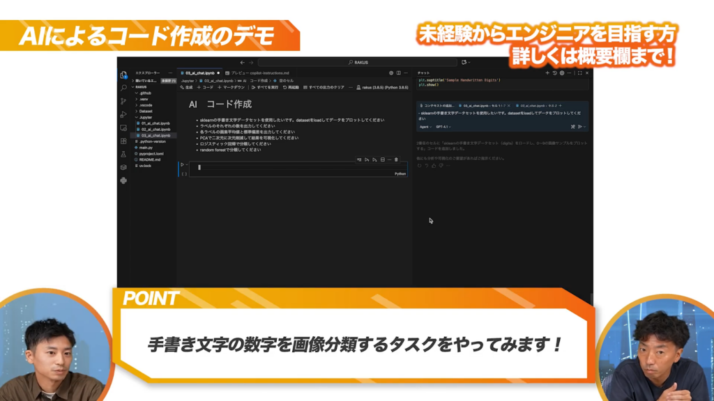 AIに丸投げするのではなく、AIエンジニアがどのような意図を持ってAIに指示を出し、コードを作成していくのか。その思考プロセスに注目してください。