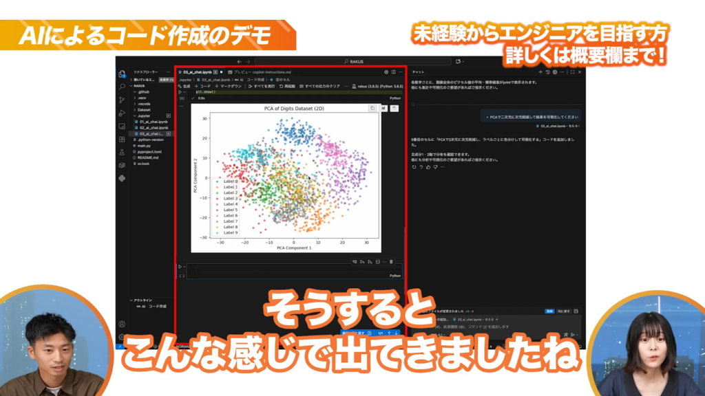 AIに「PCAで2次元に次元削減して結果を可視化して」と頼み、生成されたコードを実行すると、一瞬でX軸とY軸のグラフが生成されました。